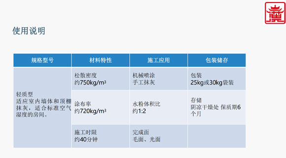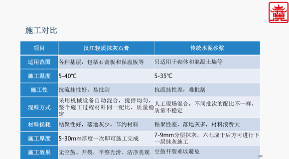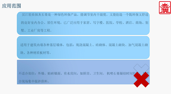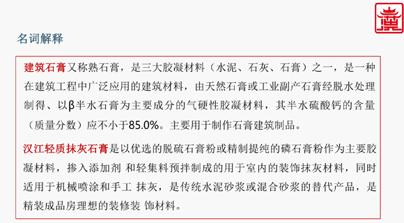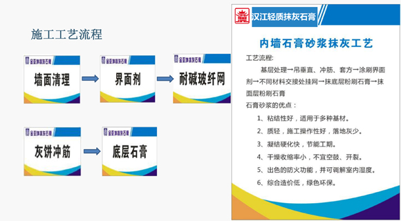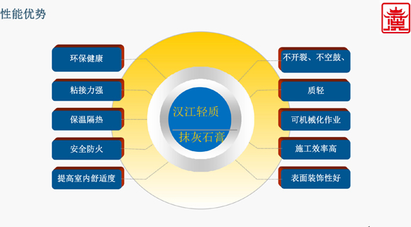 汉江轻质抹灰石膏砂浆是一种新型建筑内墙及顶板表面的抹面材料,粉刷石膏与基材粘结牢固,保水性好、干缩小不起灰、不空鼓开裂。石膏胶凝材料凝结硬化快,适用于机械化喷涂施工效率高,养护周期短,质轻经济,硬化体具有呼吸功能和防火功能。